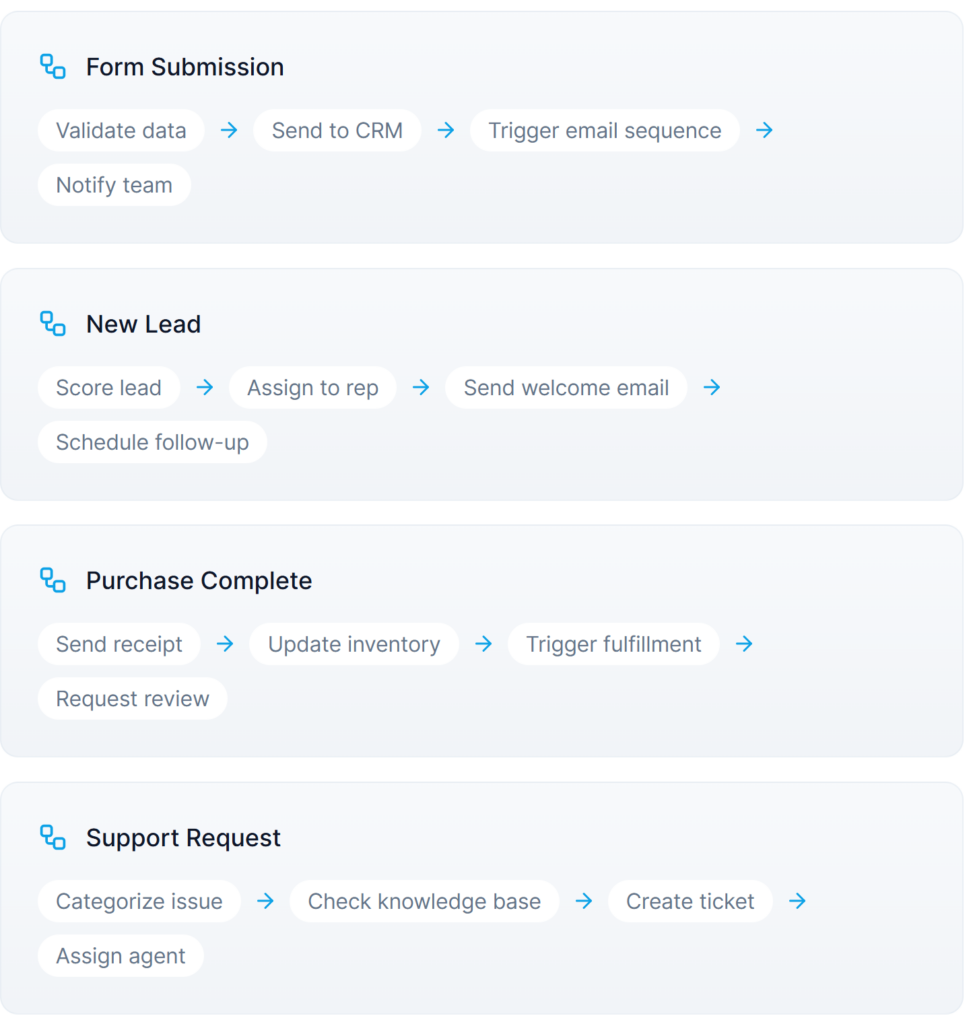 Stop doing repetitive tasks manually. We build automated workflows that connect your forms, CRM, email, messaging apps, and more — so data flows seamlessly and actions happen automatically.